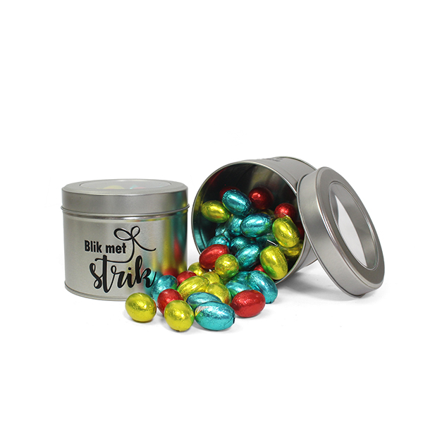 Een klein blikje wat rijkelijk gevuld is aan massieve paaseitjes. En nadat de paaseitjes weer op zijn kun je het blik weer hergebruiken voor iets anders. Het is smakelijk, handig en duurzaam.