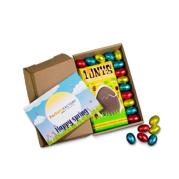Wie met Pasen echt iets opvallends wil geven, zit goed met Tony’s Verrassing. Alleen al de naam maakt nieuwsgierig, en doordat het van Tony’s Chocolonely is, voelt het voor veel ontvangers direct als een net wat specialer cadeau.Daarnaast bevat dit geschenk royaal veel chocolade, wat het extra aantrekkelijk maakt als paasattentie voor medewerkers en relaties. Een mooi pluspunt is dat je het cadeau eenvoudig persoonlijker kunt maken met een sticker van je eigen logo. Hiermee kun je je medewerkers en relaties pas écht verrassen.