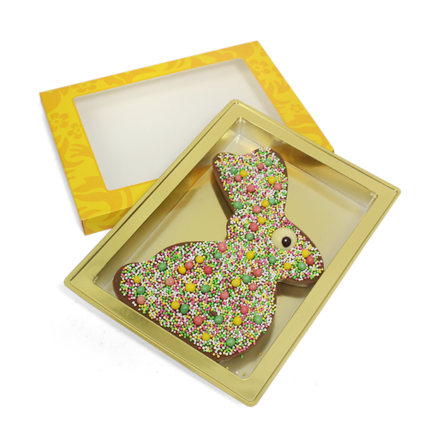 Deze vrolijke chocolade paashaas is helemaal klaar voor de Pasen. De bovenkant van de paashaas is versierd met gekleurde discodip. Met deze paashaas wordt het gegarandeerd een feest of zelfs een disco voor de ontvanger(s).